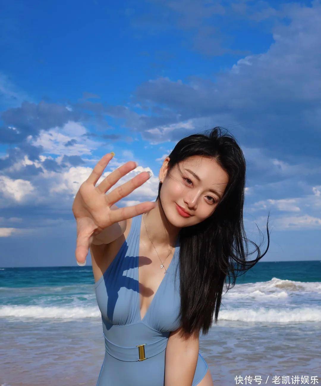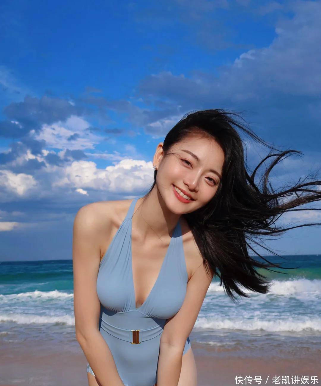 照片中她身穿粉蓝色的Deep V泳装,胸前美景十分吸睛,配上飘逸的秀发及甜美的笑容,相当迷人。